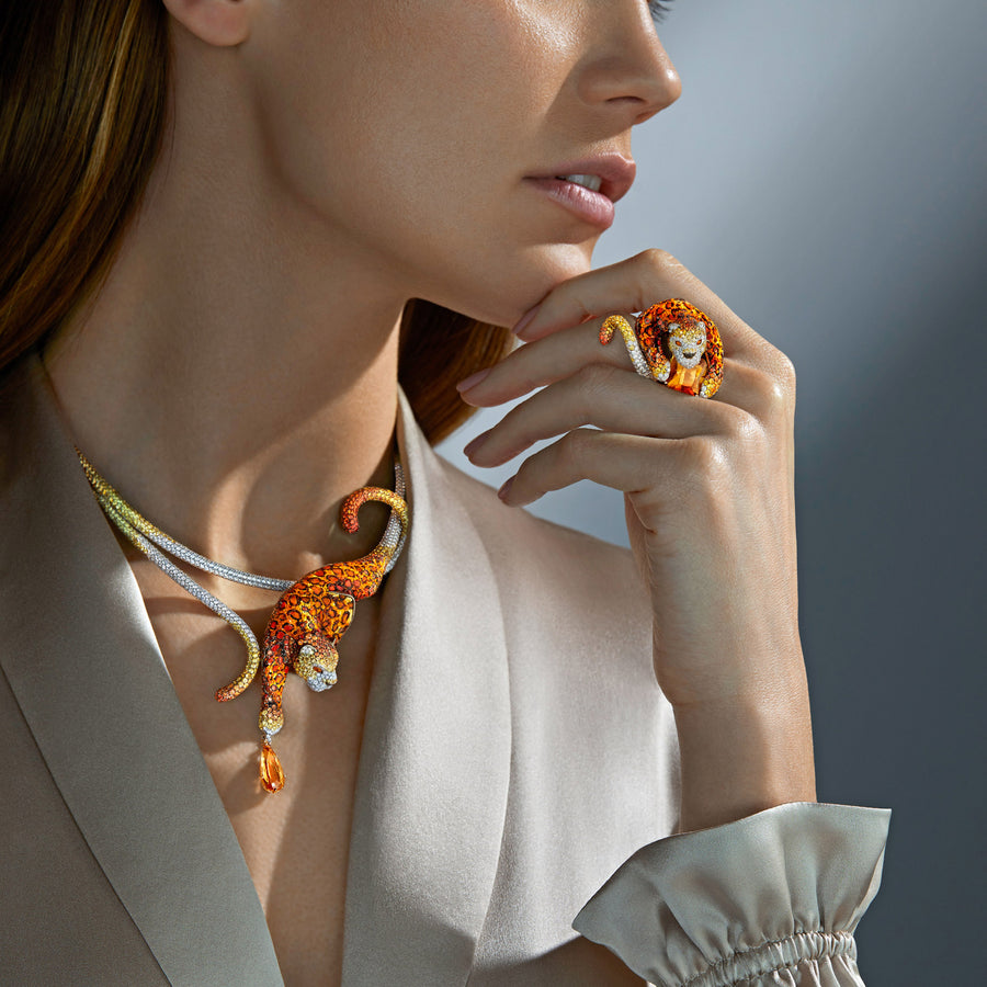 White gold, Diamonds, Black diamonds, Quartz, Orange sapphires, Yellow sapphires