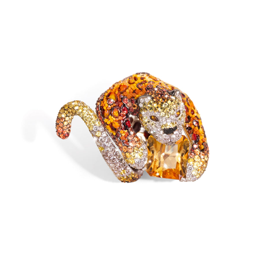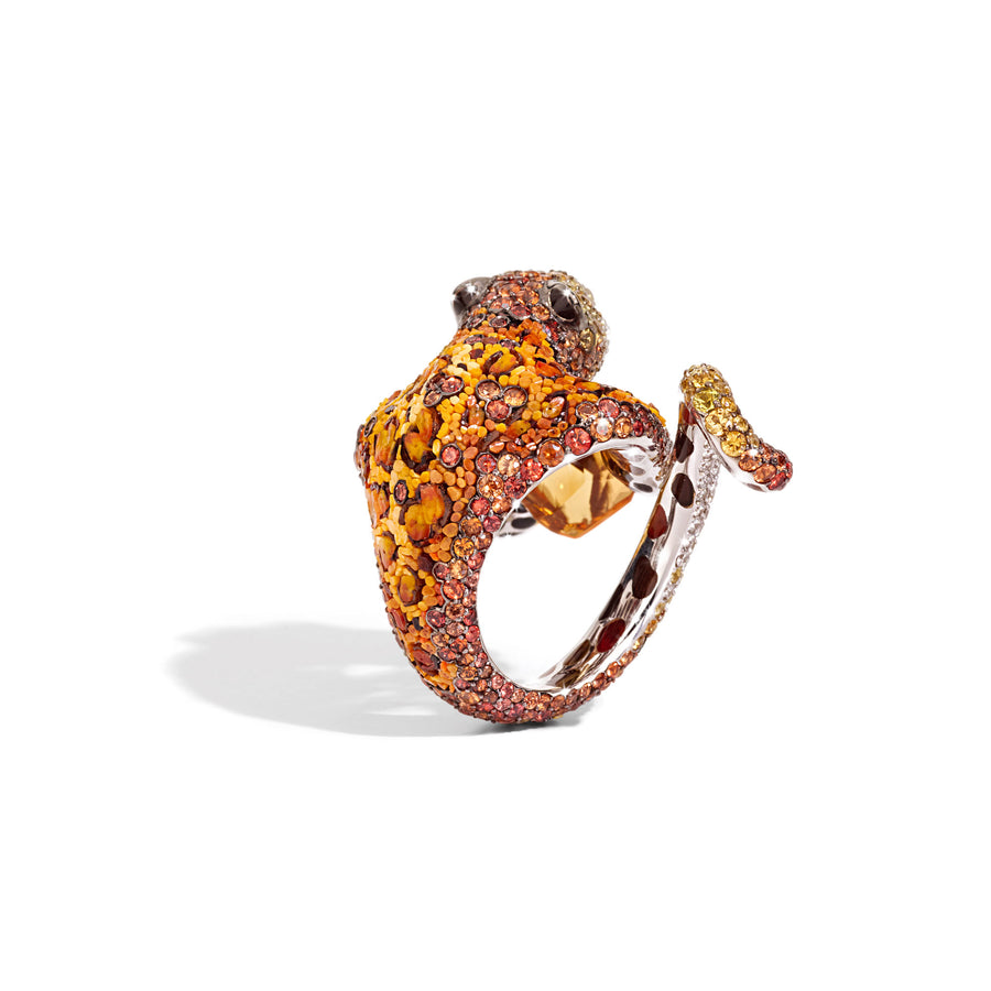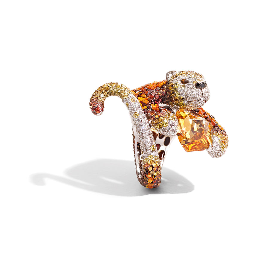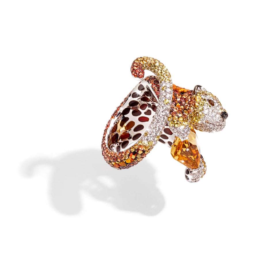 Ring in white gold with special inserts in micromosaic, diamonds, yellow and orange sapphires.