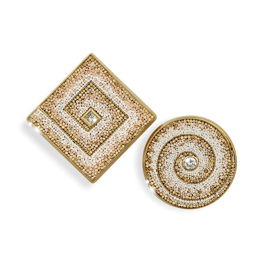 Micromosaic earrings in yellow gold and diamonds. Designed by Roger Thomas.