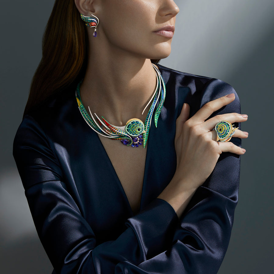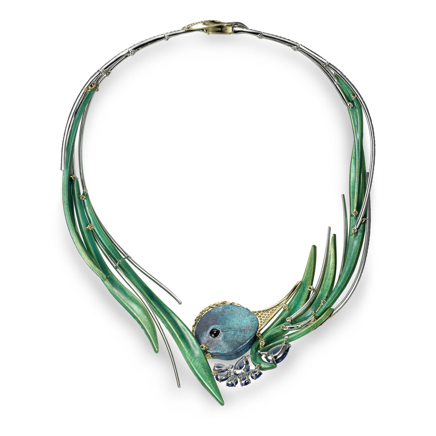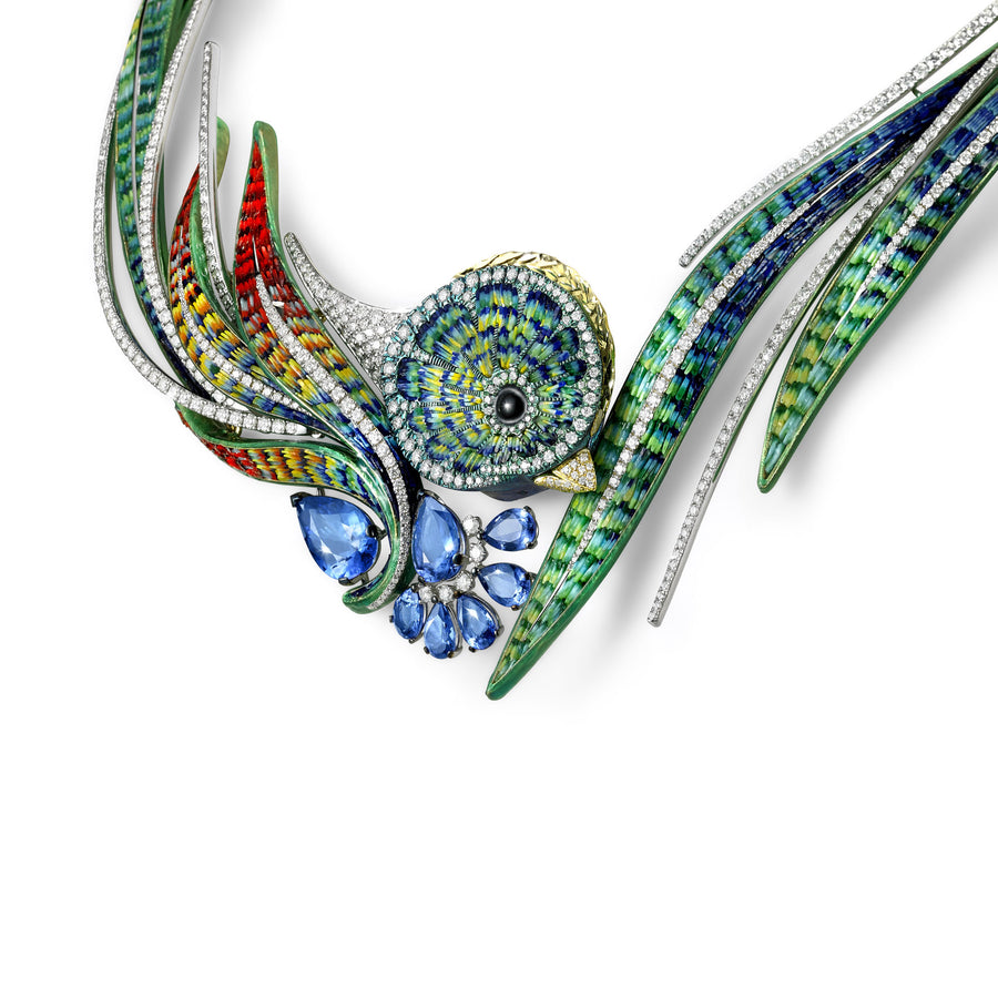 Introducing the Quetzal necklace, a true masterpiece of elegance and artistry. At its center lies the head of the majestic Quetzal bird, adorned with white diamonds. The centerpiece seamlessly transitions into the bird’s stunning feathers, which frame the necklace with exquisite detail. Nestled at the center of the piece are glorious tanzanites.