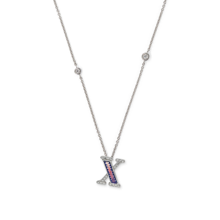 Necklace in white gold with letter X pendant decorated in micromosaic and diamonds. The micromosaic pattern is customizable and can be chosen among the ones available for the collection. White gold clover can be added on the letter.