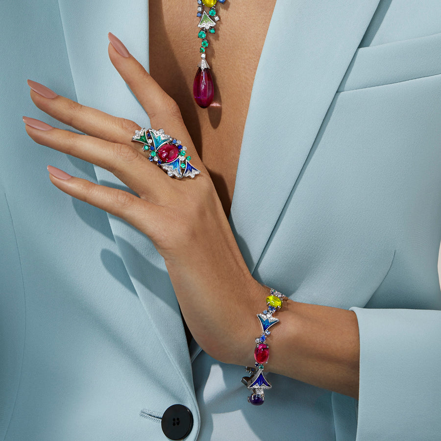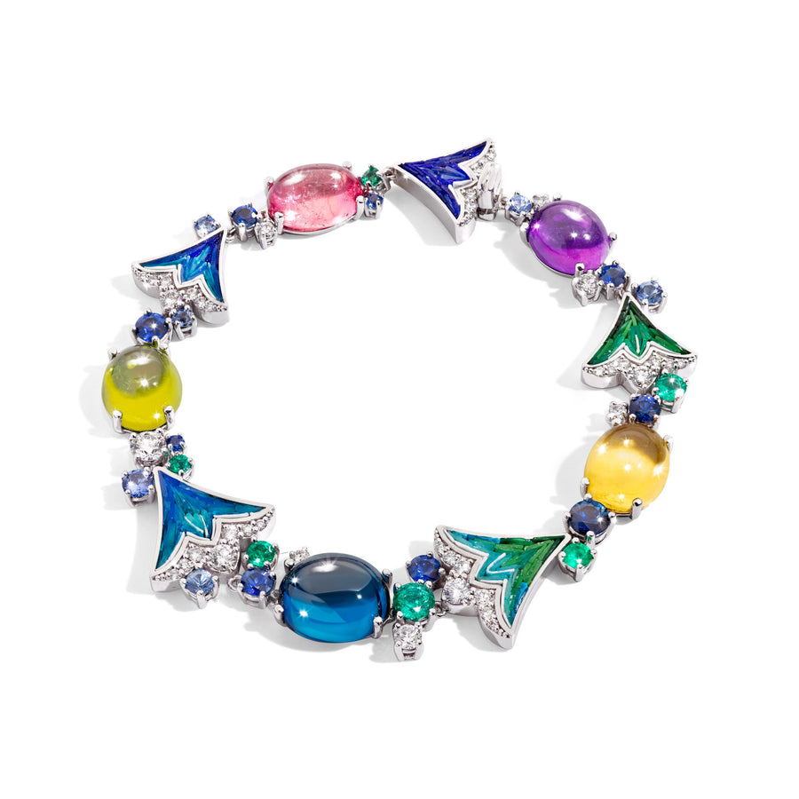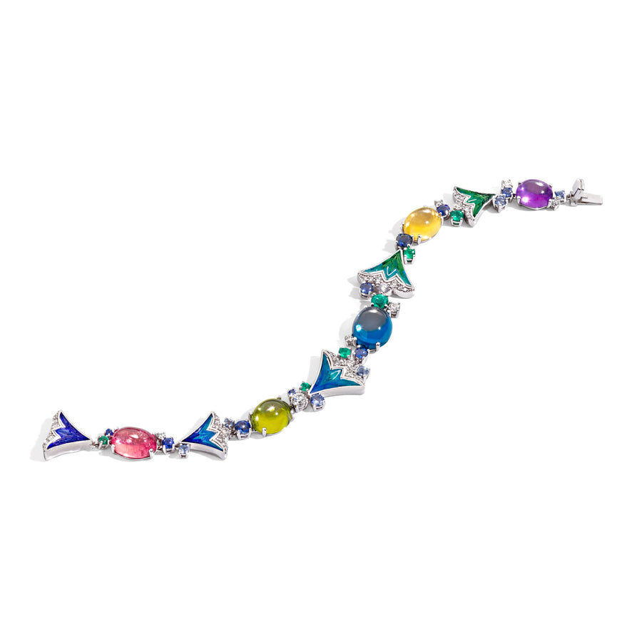 Bracelet in white gold with coloured cabochon gemstones and micromosaic decoration.