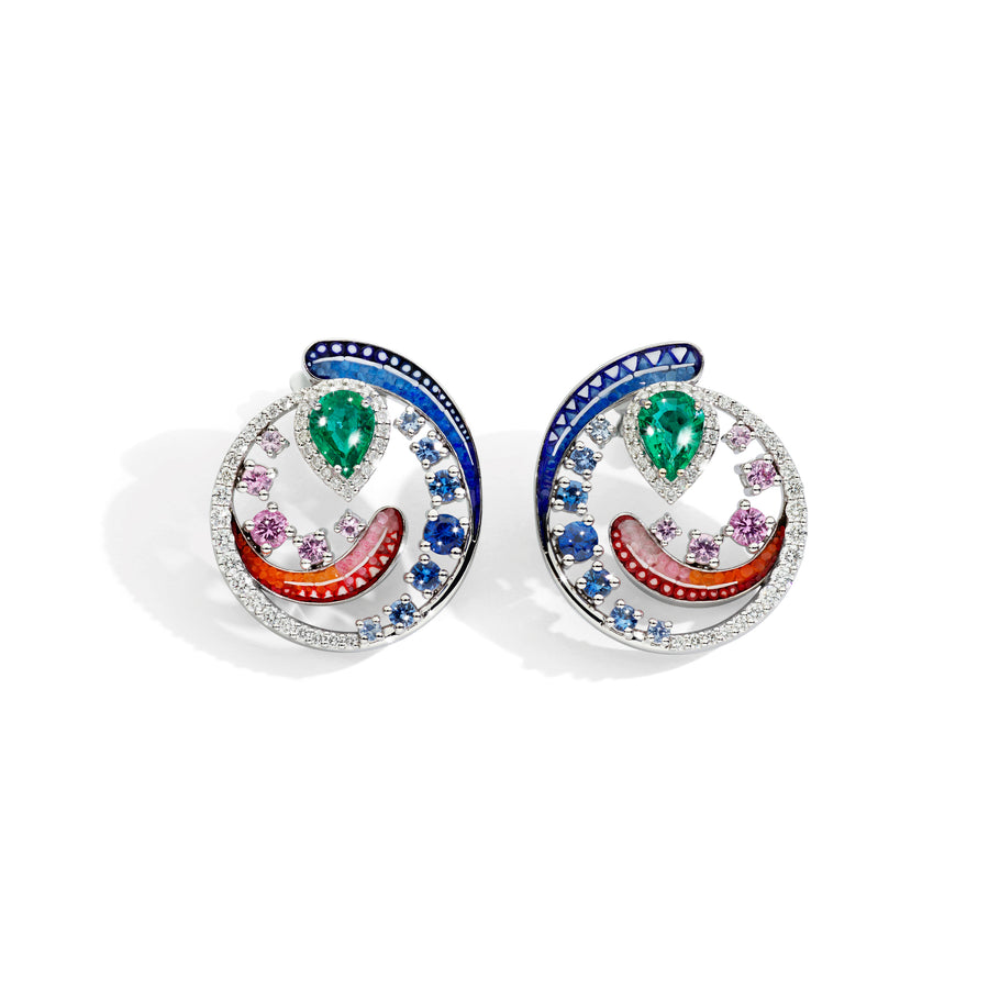 The Colibrì earrings are a radiant expression of nature’s elegance, where light and color intertwine in perfect harmony. A luminous halo of white diamonds encircles delicate leaf-like forms, their surfaces brought to life through micromosaics and a vibrant array of sapphires. Suspended above, an inverted emerald teardrop adds a touch of brilliance that graciously ties the piece together.