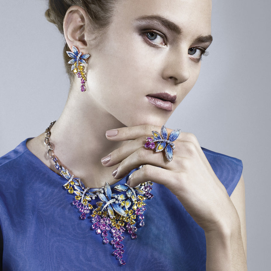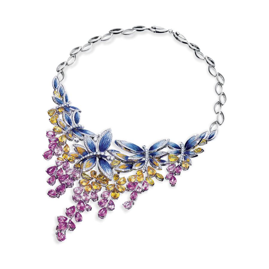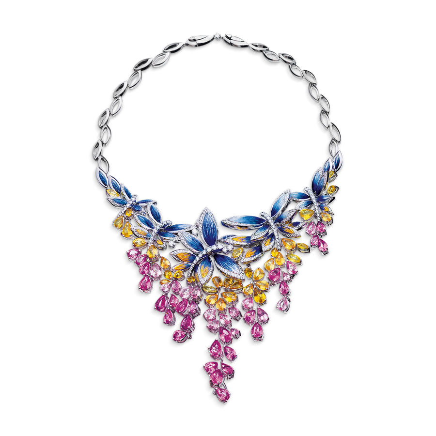 Coloured fireflies bright up the sky and your skin. Necklace made of white gold, embellished with micromosaic, diamonds and a cascade of sapphires.