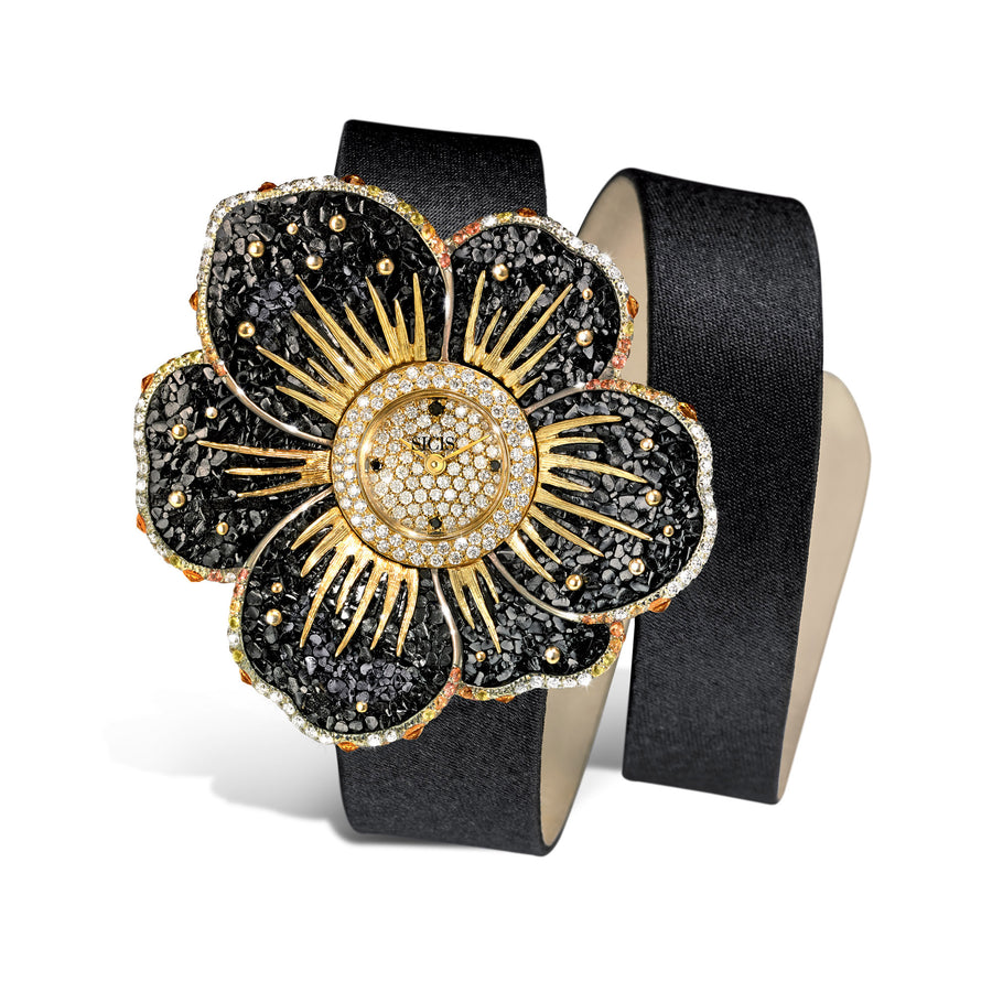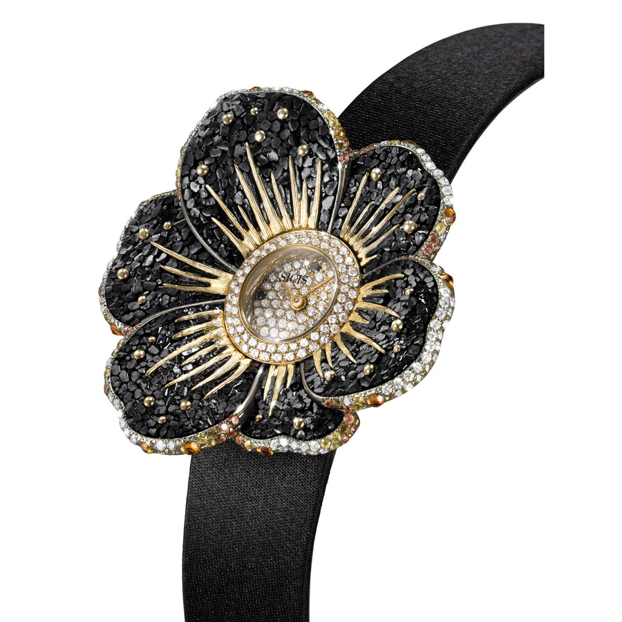 Enter a realm of enchantment with the Gardenia Imperialis Watch, a true masterpiece of elegance. Crafted with meticulous artistry, its intricate design showcases mesmerizing black and gold micromosaic petals, while the case is adorned with a dazzling display diamonds. The refined double band, fashioned from lustrous black satin, adds a touch of sophistication.