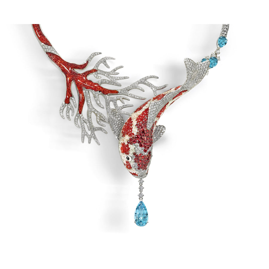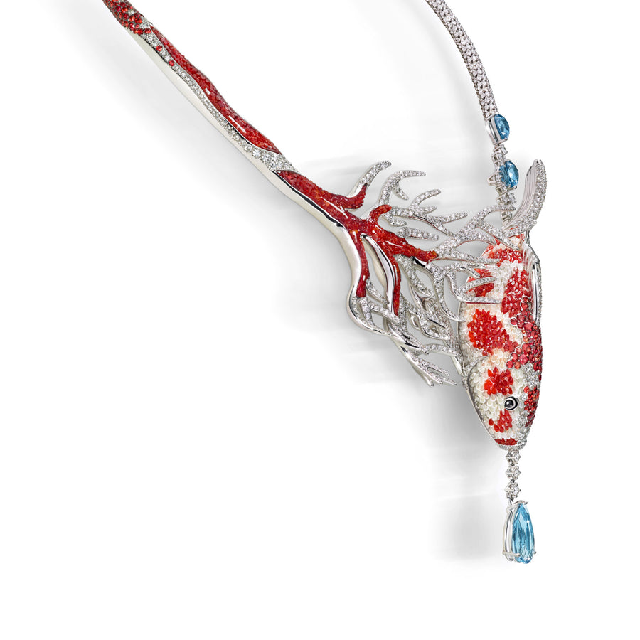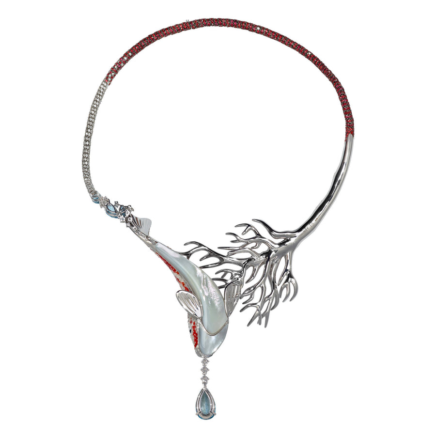 Necklace in white gold with micromosaic, diamonds, mother of pearl, orange and yellow sapphires and aquamarines.