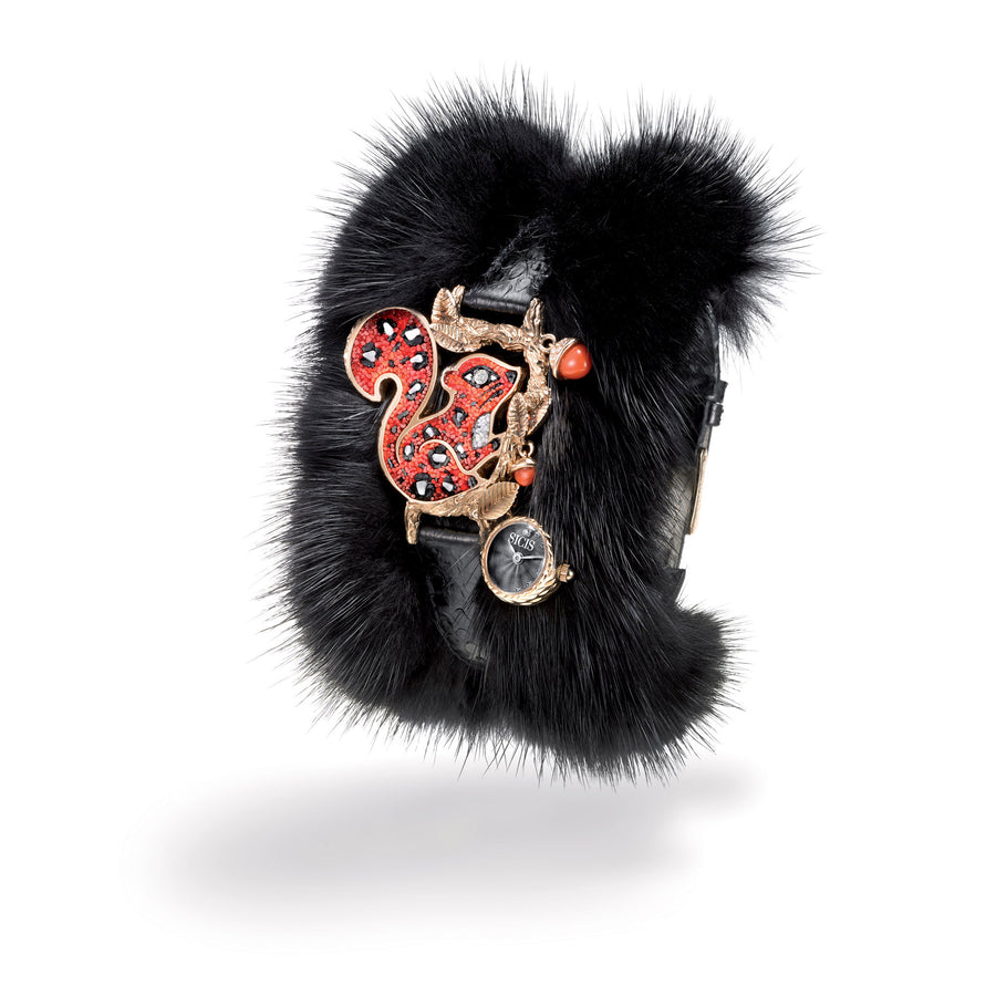 Materials: White and rose gold, Diamonds, CoralCase shape: RoundCase diameter: 12mmBand material: Fur and leatherBand colour: BlackSize: MMovement: QuartzFunctions: Hour, Minute