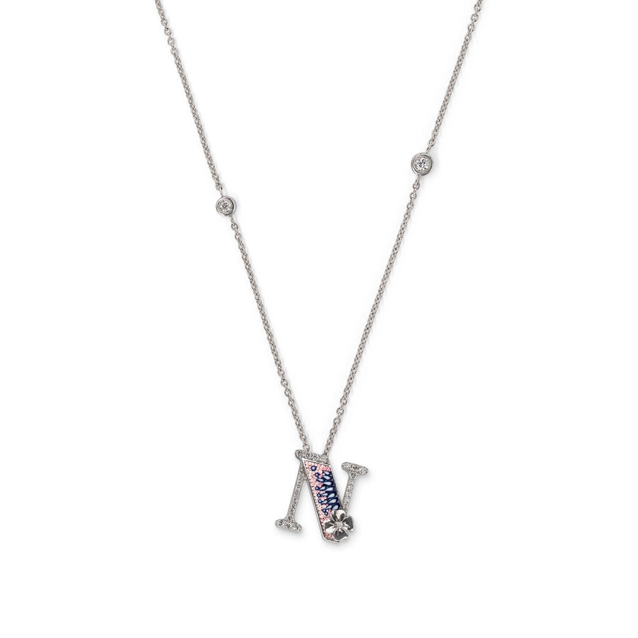 Necklace in white gold with letter N pendant decorated in micromosaic and diamonds and clover in white gold. The micromosaic pattern is customizable and can be chosen among the ones available for the collection. Also available without clover.