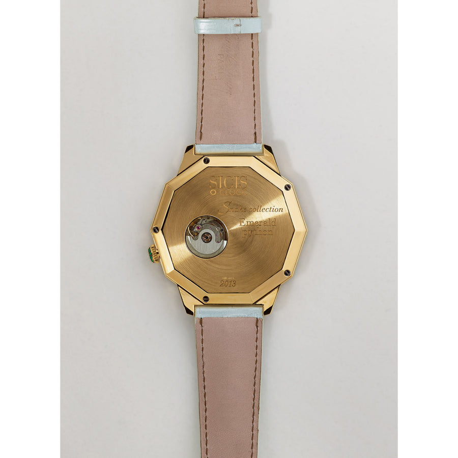 Materials: Yellow gold, White diamonds, EmeraldsCase shape: DecagonalCase diameter: 55mmBand material: LeatherBand colour: WhiteSize: MMovement: AutomaticFunctions: Hour, Minute
