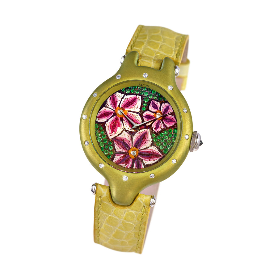 Watch in gold, diamonds, sapphires and tsavorites with dial in micromosaic. Yellow leather strap.