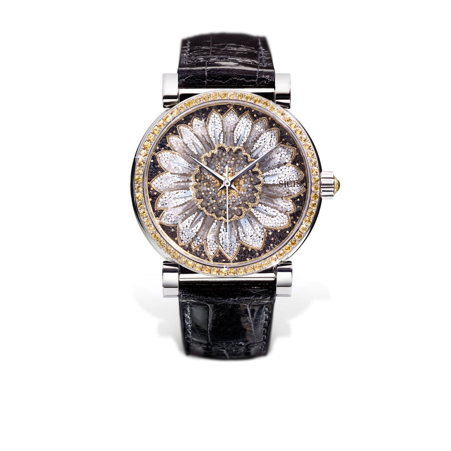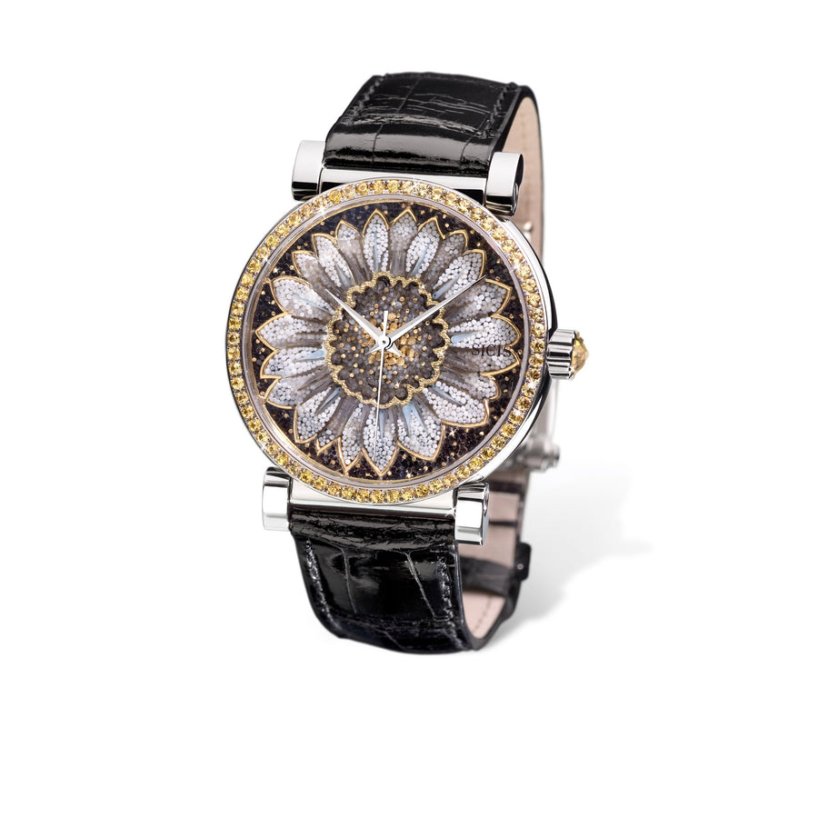 Micromosaic watch in gold and yellow sapphires. Swiss Made.