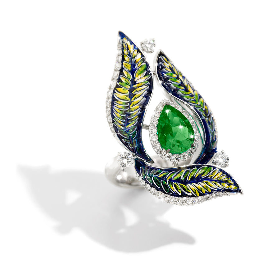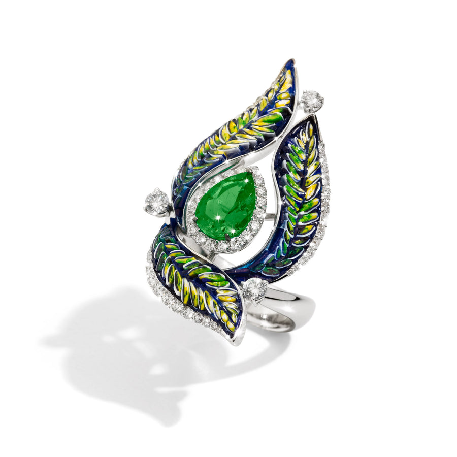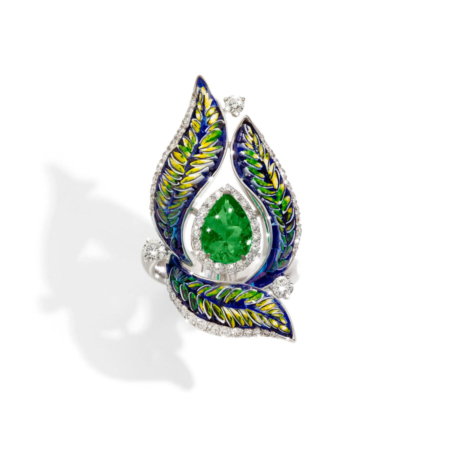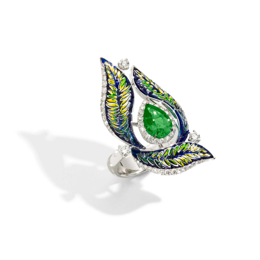 Ring in white gold with fern leaves in micromosaic, pear emerald and diamonds.
